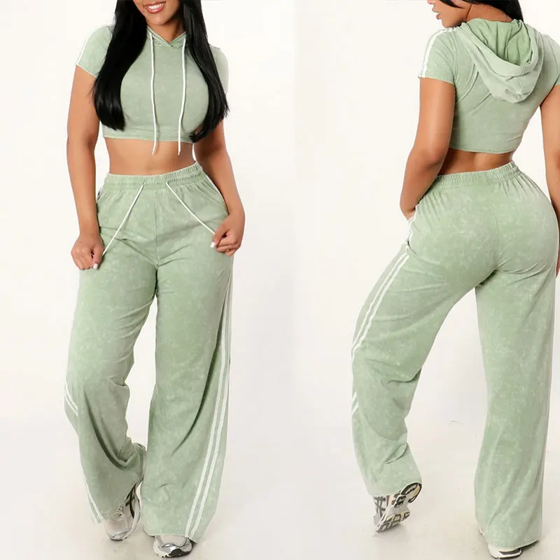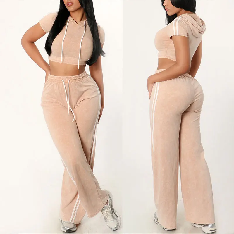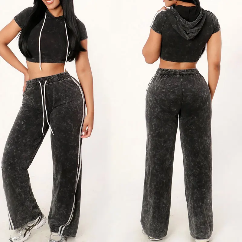 OEM Huili Women's Gym Activewear Set Custom Logo Skinny Loungewear Crop Top Baggy Pants Vintage Washed Style Cotton Knitting